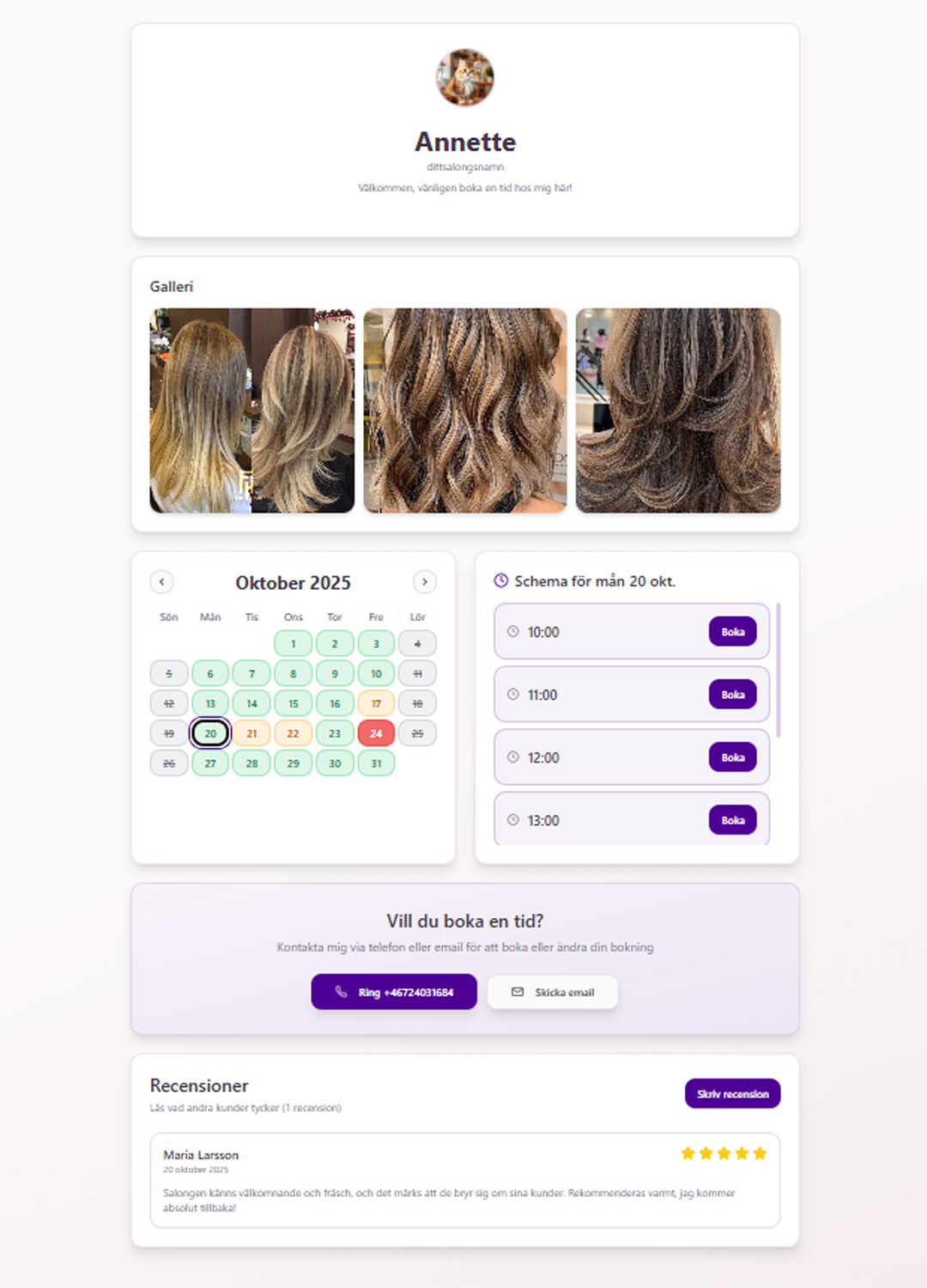 Kunder kan boka tider direkt online eller kontakta dig med ett klick.