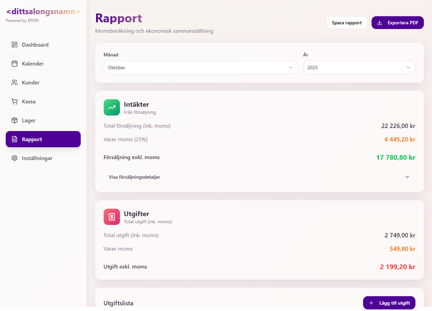 Systemet räknar själv ut moms, resultat och underlag för årsbokslut – så du slipper huvudvärken.